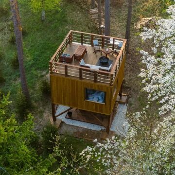 V první řadě netradiční zážitek glampingu v moderním vyhlídkovém posedu. Na uvítanou na Tebe bude čekat láhev oblíbeného nápoje, kterou si můžeš třeba vychutnat v křesle a koukat do plápolajícího ohně v krbových kamnech nebo na prostorné vyhlídkové terase. Určitě se necháš zlákat královsky velkou postelí, která Ti nabízí nejen luxusní pohodlí, ale i nádherný výhled do lesní krajiny.